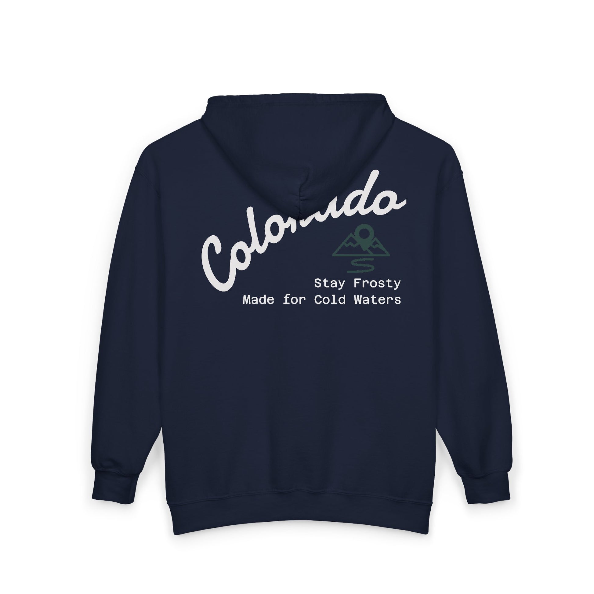 A rugged, cozy zip-up hoodie that feels like a chilly morning at the reservoir. The black zip sweatshirt wears a small, vintage-style chest graphic and a larger, hand-lettered “Colorado” design across the back with frosty mountain art and the line “Stay Frosty / Made for Cold Waters.” It’s built to layer over tees for dawn patrols, weekend drives, and late-night bonfires.