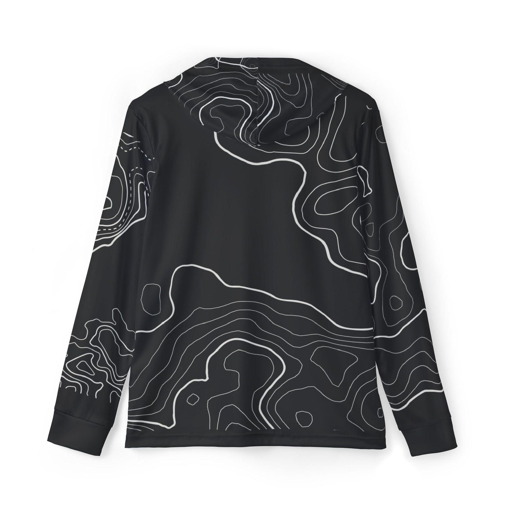 The extra-light polyester breathes and dries fast, pulling moisture away so you stay composed during warmups, trail runs, or travel days. The hood offers extra coverage and sun protection (UPF 50+), while the sleek black-and-gray contour lines give an understated, navigational look that reads equally well at the track or on a laid-back weekend outing. Comfortable, quick-drying, and made with matched seam threads and a printed care label inside the hood for a clean finish.