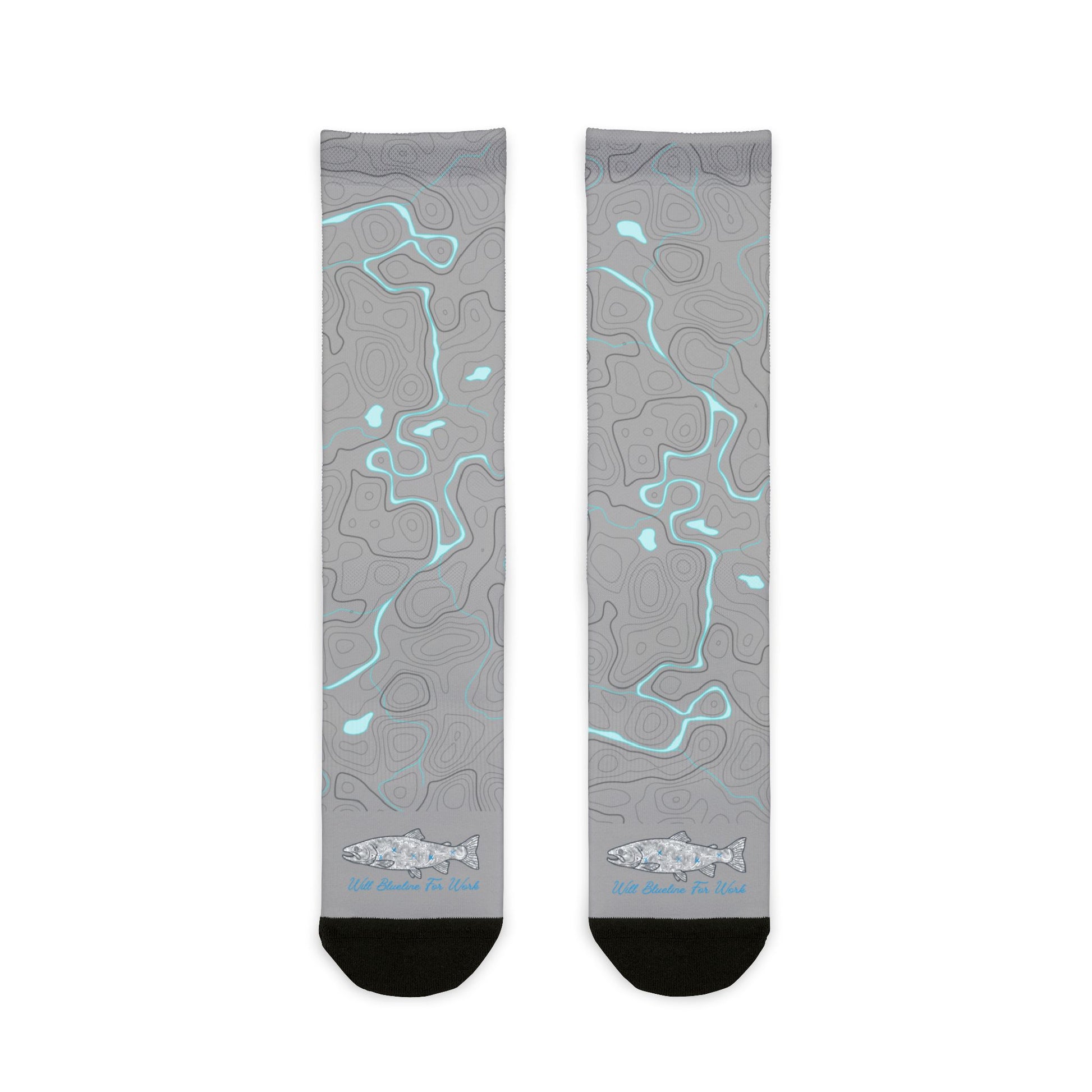 Designed for anglers who notice the details, the Topo Flow Fly Fishing Socks blend subtle river-inspired design with all-day comfort. A muted topographic map pattern traces flowing water lines across a neutral gray base, finished with understated River Worn branding at the toe. Nothing loud. Nothing gimmicky. Just clean gear that fits the way you fish.
